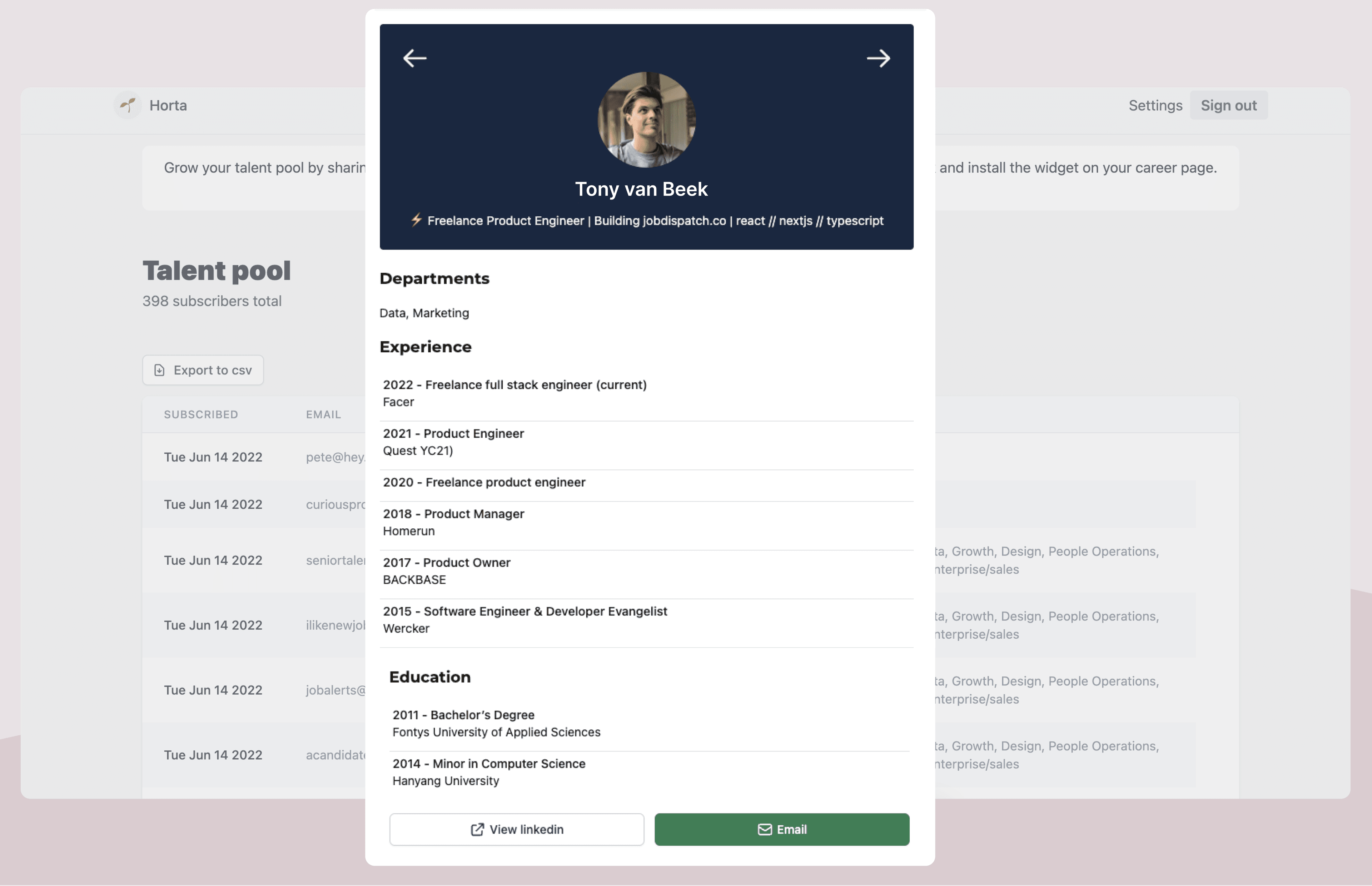 You will always get talent’s email address and the departments they’re interested in, and they can also share their Linkedin profile. In this case, Horta will also store their employment and education information (e.g. current job, past employers).